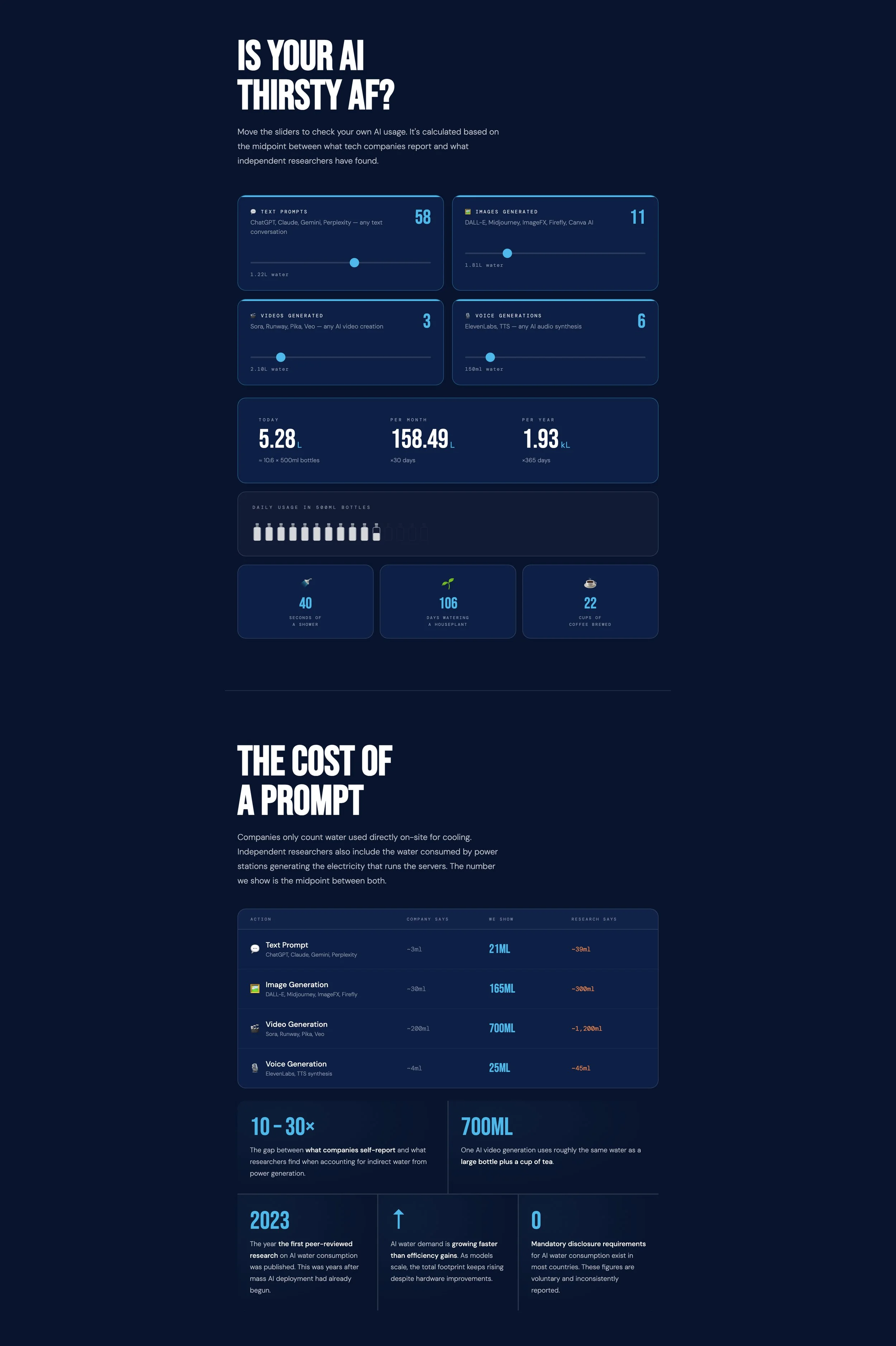 Using data from independent studies and data provided by AI companies, we use the midpoint between them to give an estimate of how much water you’re using when you prompt.